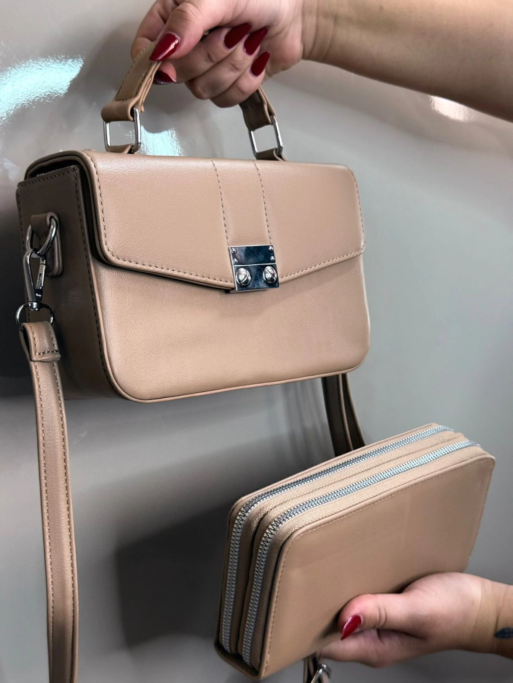 Com design espaçoso, a bolsa comporta seus pertences com facilidade, enquanto a carteira completa o conjunto, ideal para guardar documentos, cartões e dinheiro com segurança.